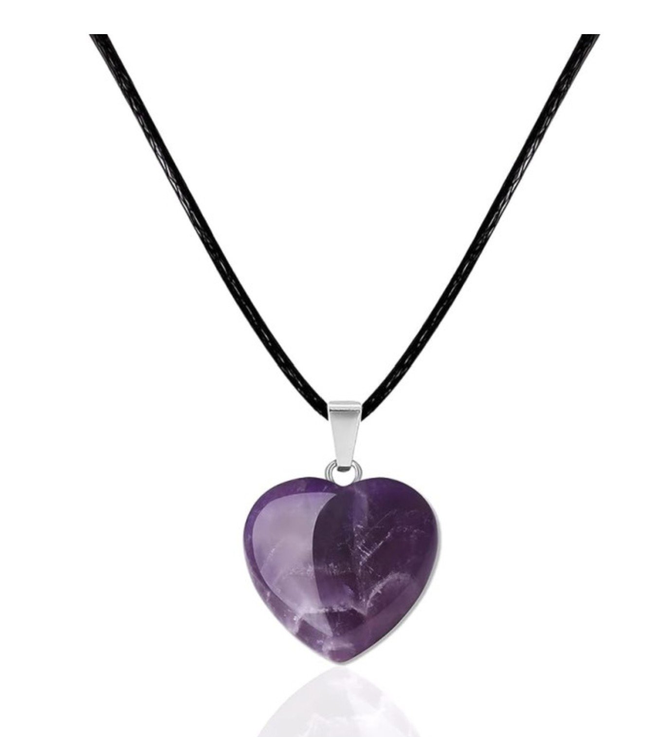 Collar con dije en forma de corazón elaborado con amatista natural, piedra asociada a la serenidad, la claridad mental y la protección espiritual. Ideal para quienes buscan equilibrio emocional y una conexión energética suave y consciente.