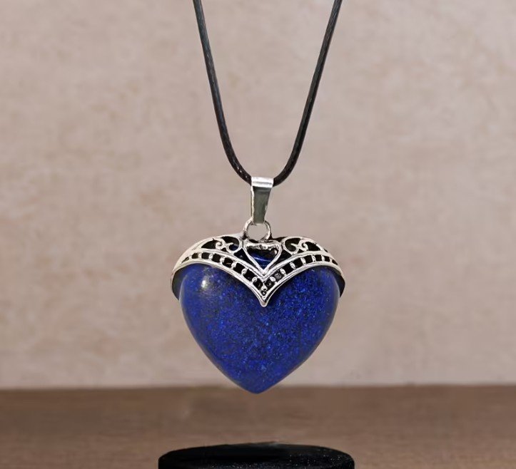 Collar con dije en forma de corazón elaborado en lapislázuli, piedra relacionada con la claridad mental, la confianza y el equilibrio emocional. Ideal para uso diario y como amuleto personal.