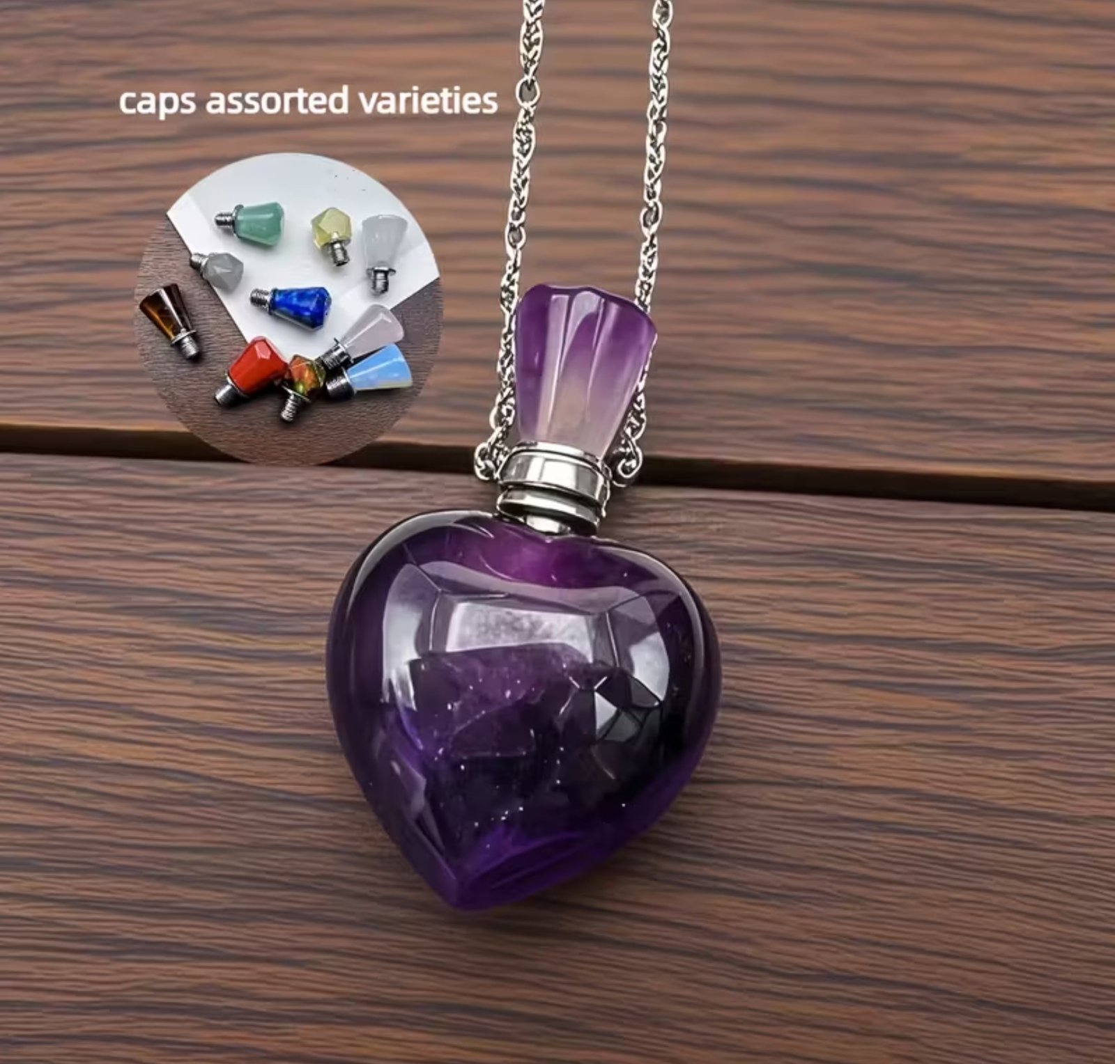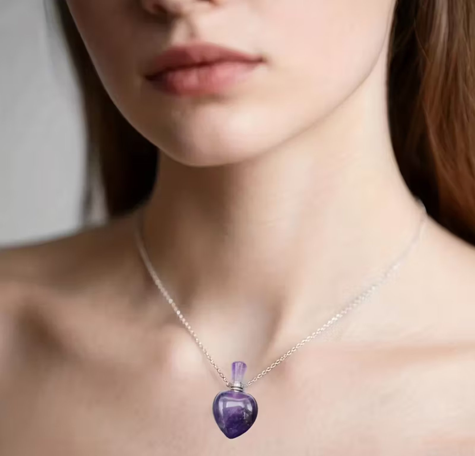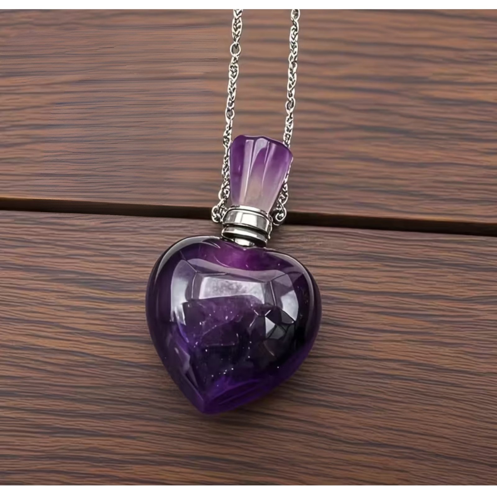 El collar con dije perfumero de amatista natural, ideal para aromaterapia personal. Asociado a la calma, protección y equilibrio emocional, permite llevar tu aroma favorito de forma sutil y elegante.