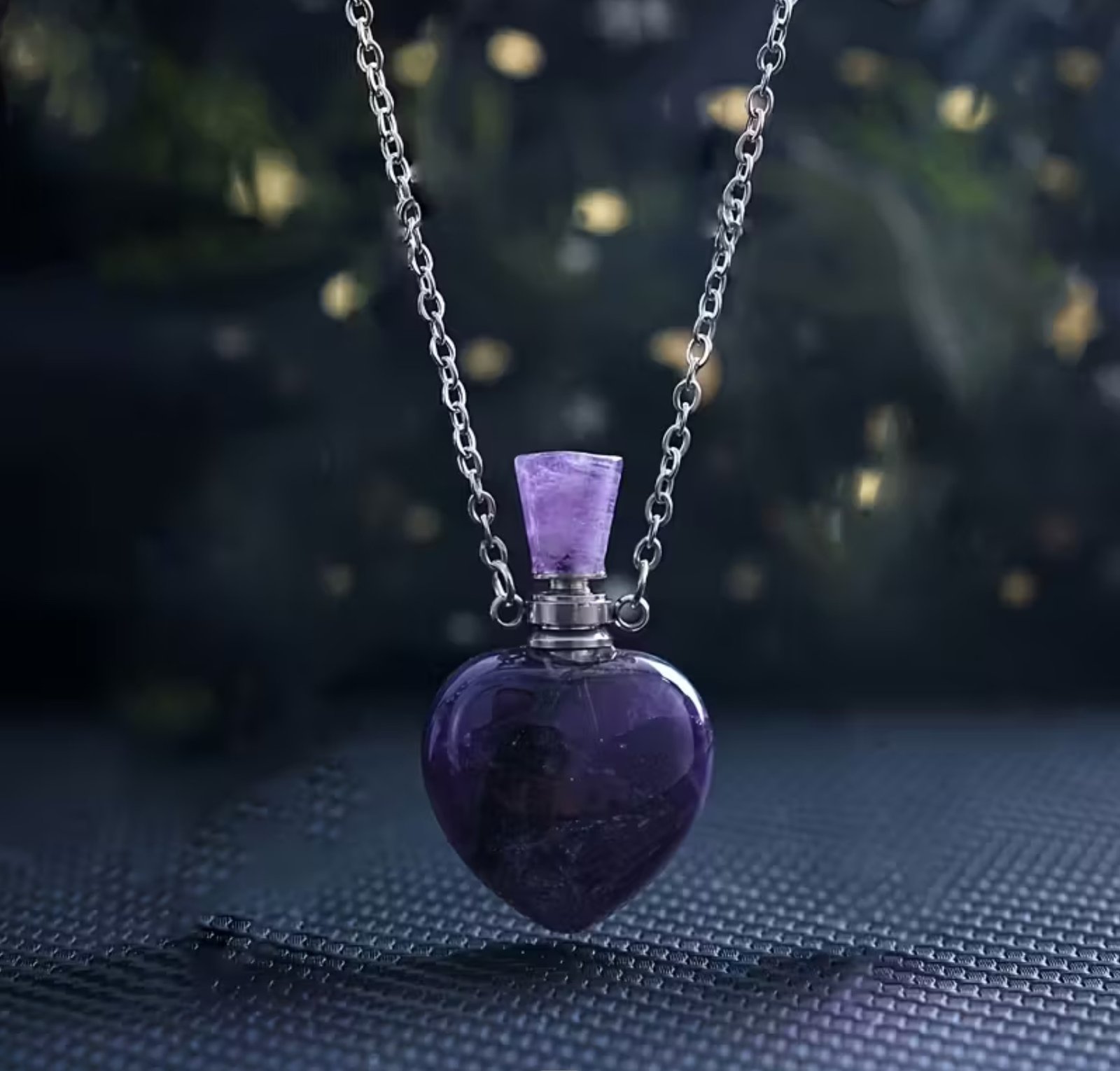 El collar con dije perfumero de amatista natural permite llevar tu aroma favorito de forma sutil y elegante. La amatista es conocida por sus propiedades de calma, protección y equilibrio emocional, lo que lo convierte en un accesorio ideal para el uso diario. Al estar elaborado con piedra natural, cada pieza presenta ligeras variaciones en color y forma.
