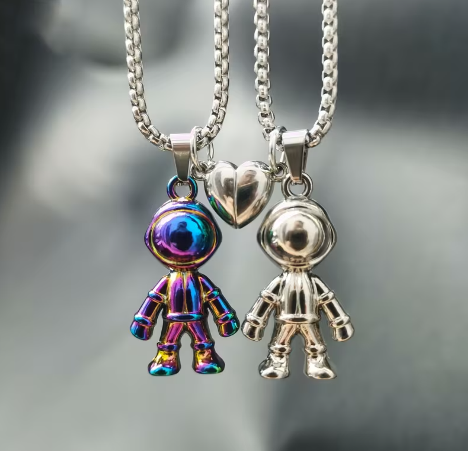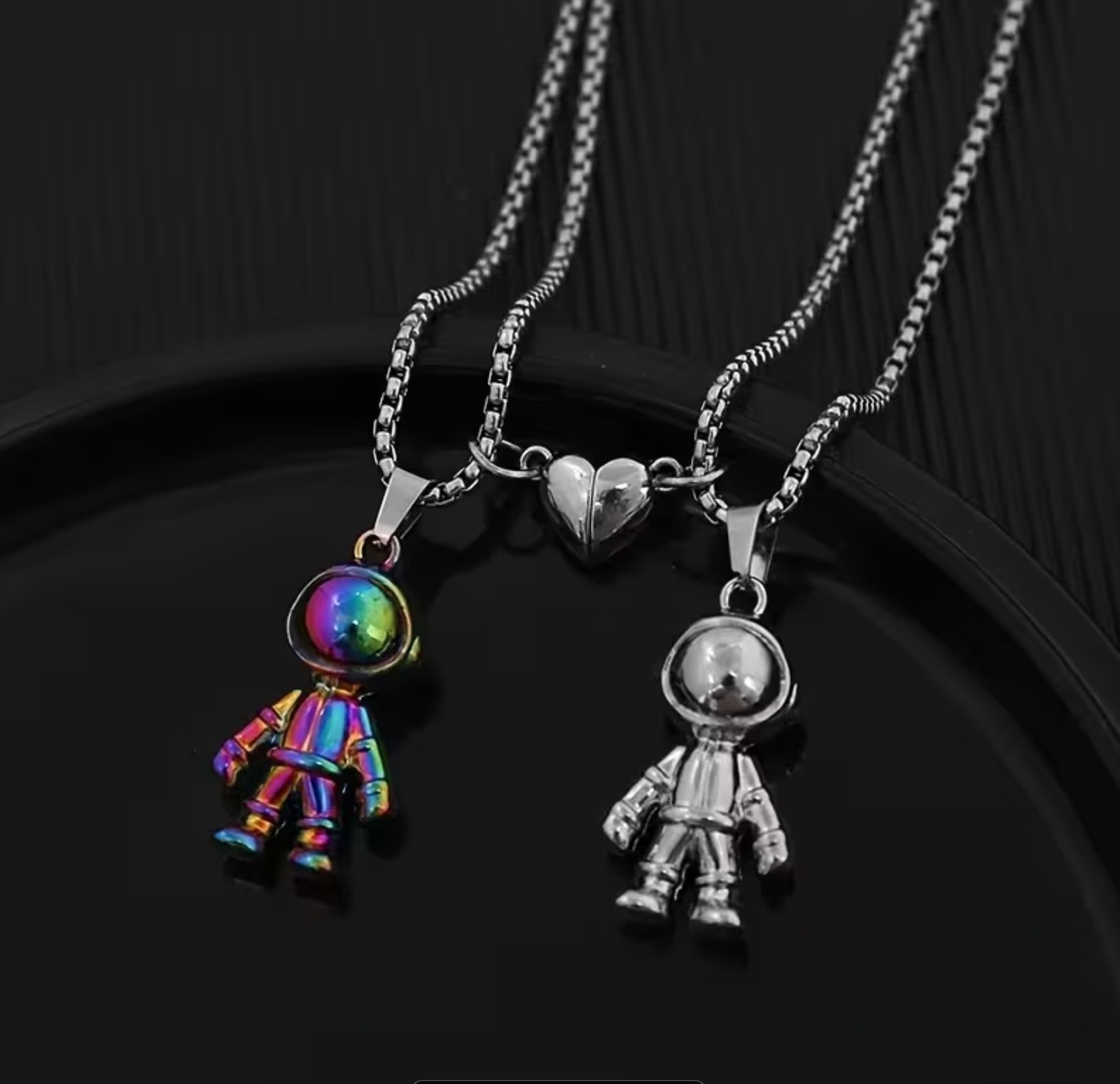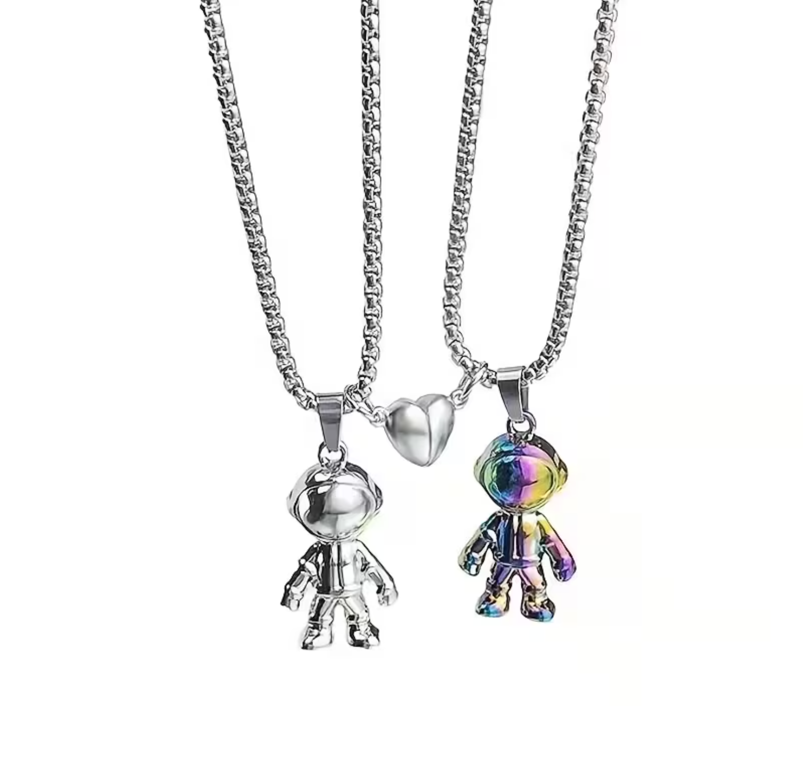 Set de collares de pareja de acero inoxidable con diseño de astronautas, inspirados en el cosmos y los vínculos que trascienden tiempo y distancia. Resistentes, duraderos e ideales para uso diario. 🚀✨