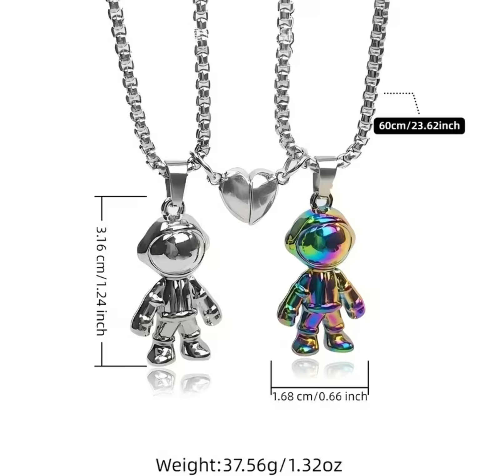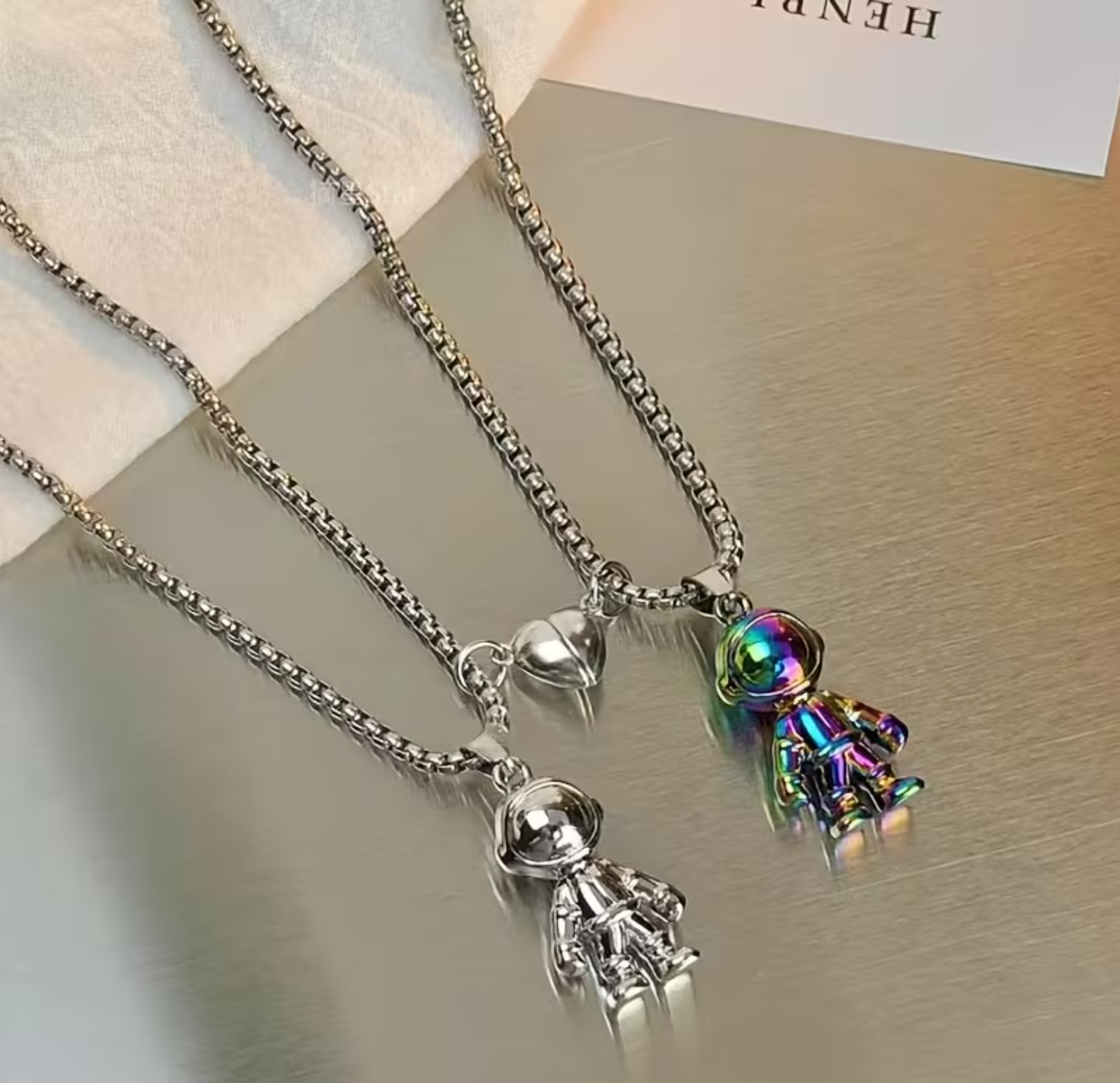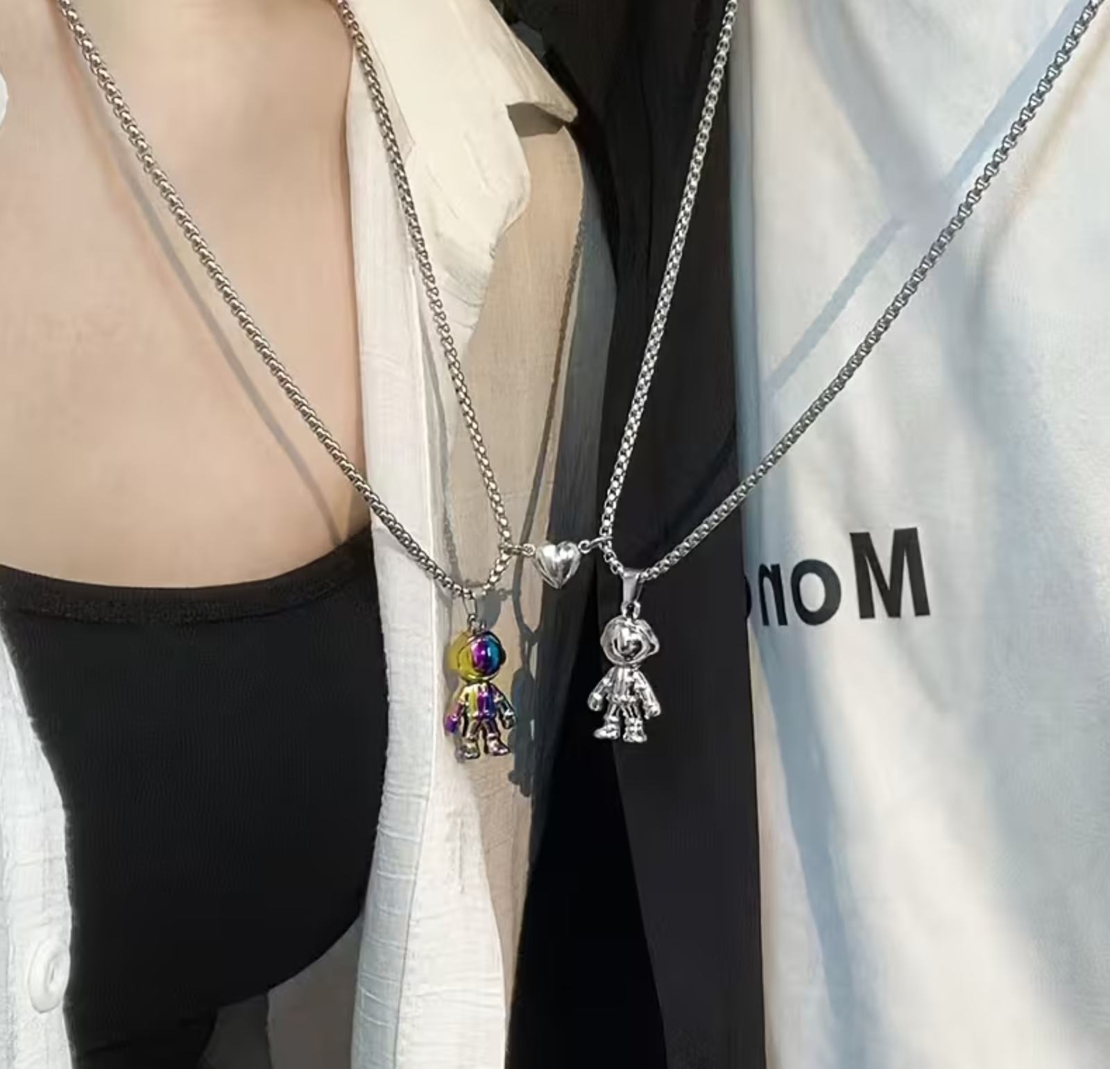 Set de collares de pareja de acero inoxidable con diseño de astronautas, inspirados en el cosmos y los vínculos que trascienden tiempo y distancia. Resistentes, duraderos e ideales para uso diario. 🚀✨