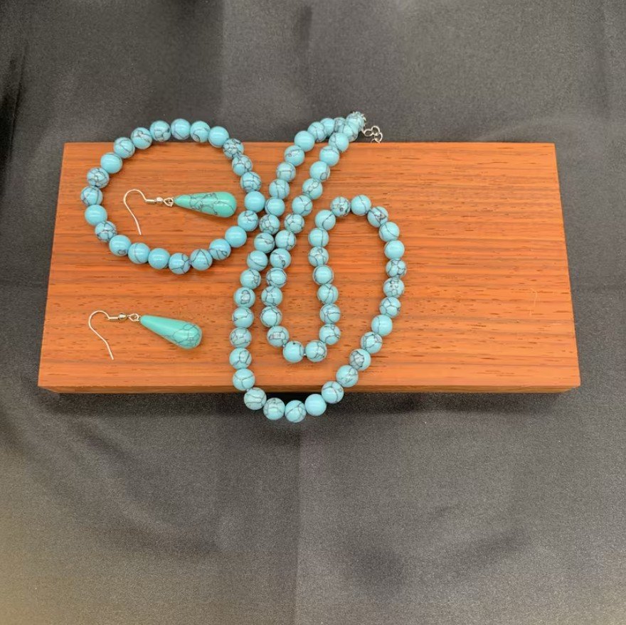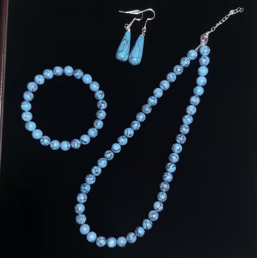 Conjunto de joyería elaborado con Turquesa natural, reconocida por su color azul característico y vetas únicas. Esta piedra se asocia a la protección, la tranquilidad y el equilibrio, ideal para uso diario o para regalar como un detalle especial.