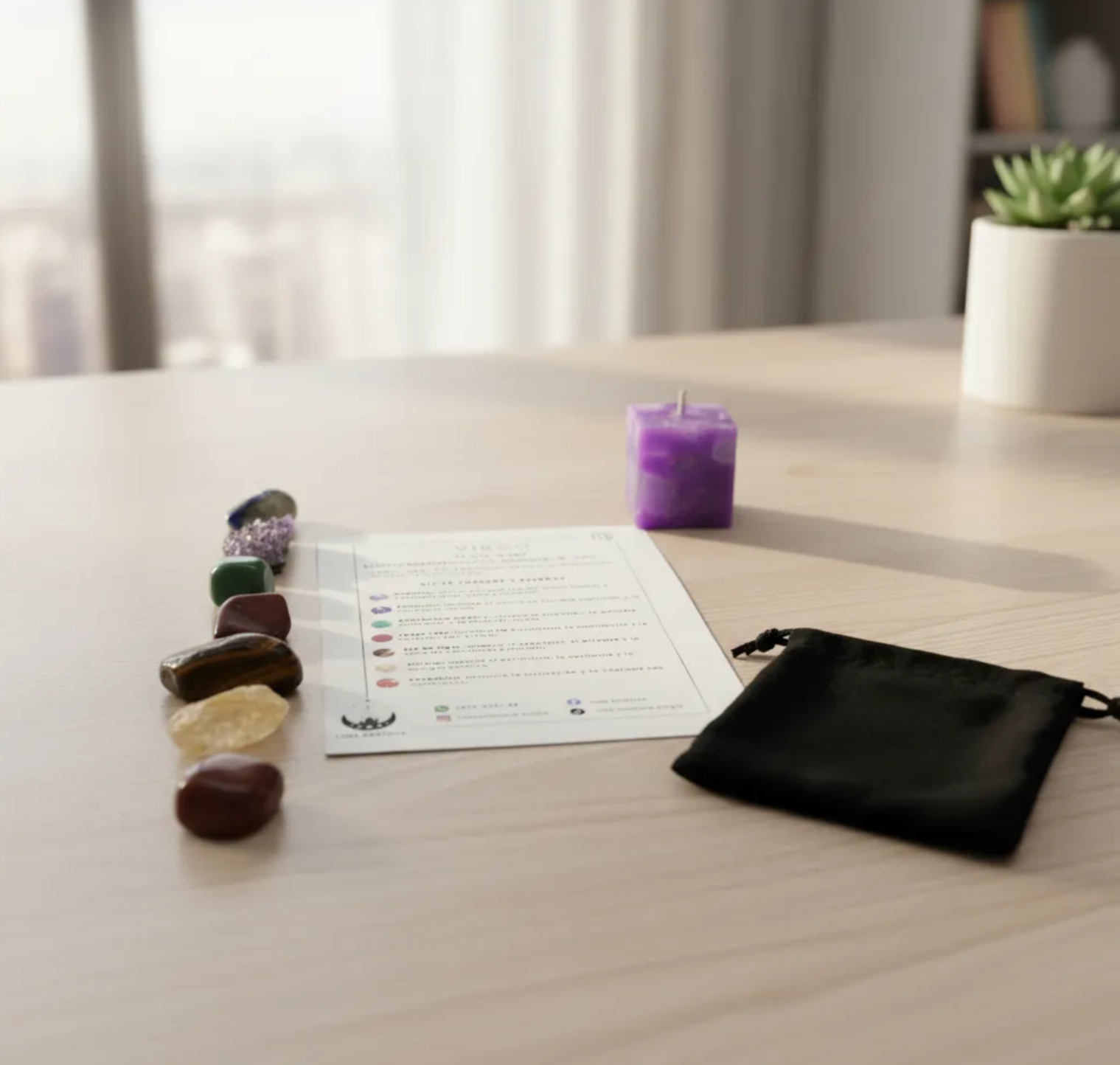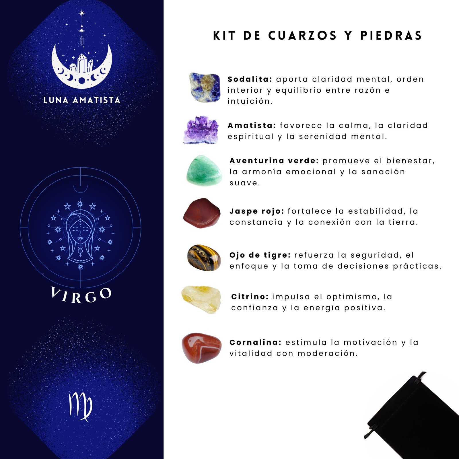 Kit de cuarzos y piedras naturales para Virgo que favorece la claridad mental, el equilibrio emocional y la estabilidad. Ideal para fortalecer el enfoque, la serenidad y la conexión con la energía de la tierra.