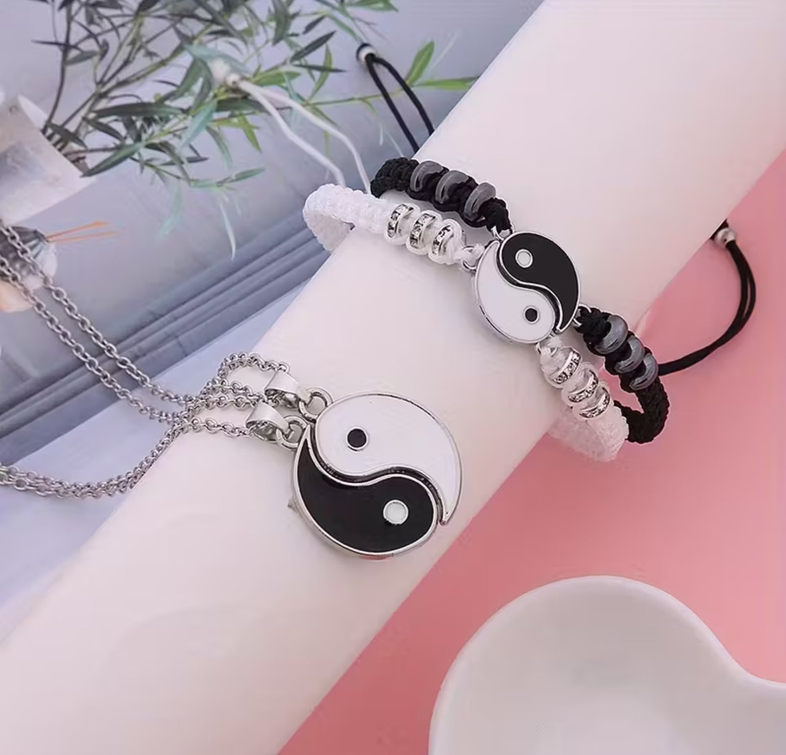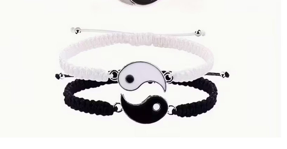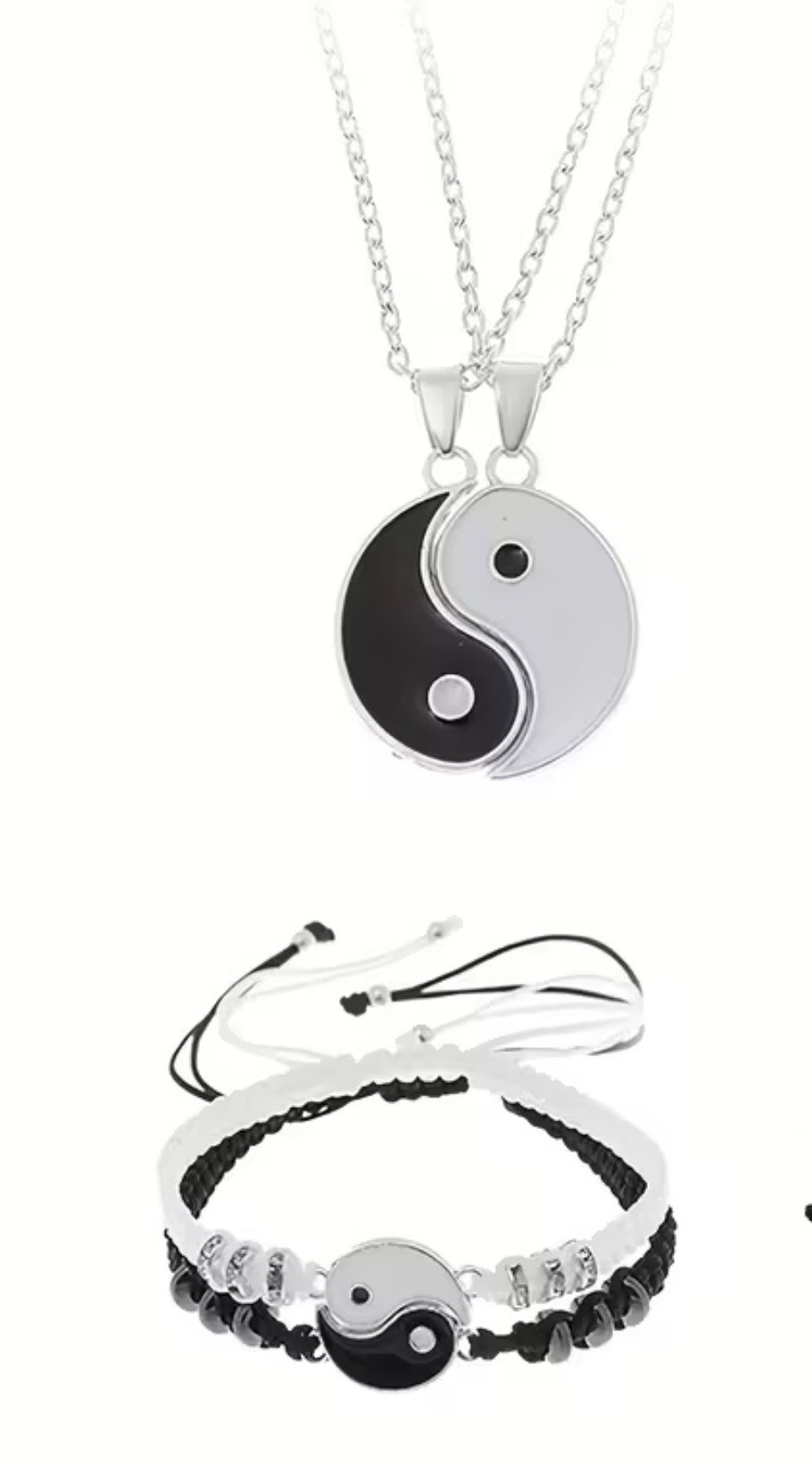 Set de pareja Yin Yang de 4 piezas en acero inoxidable: dos collares y dos pulseras, símbolo de equilibrio y unión.