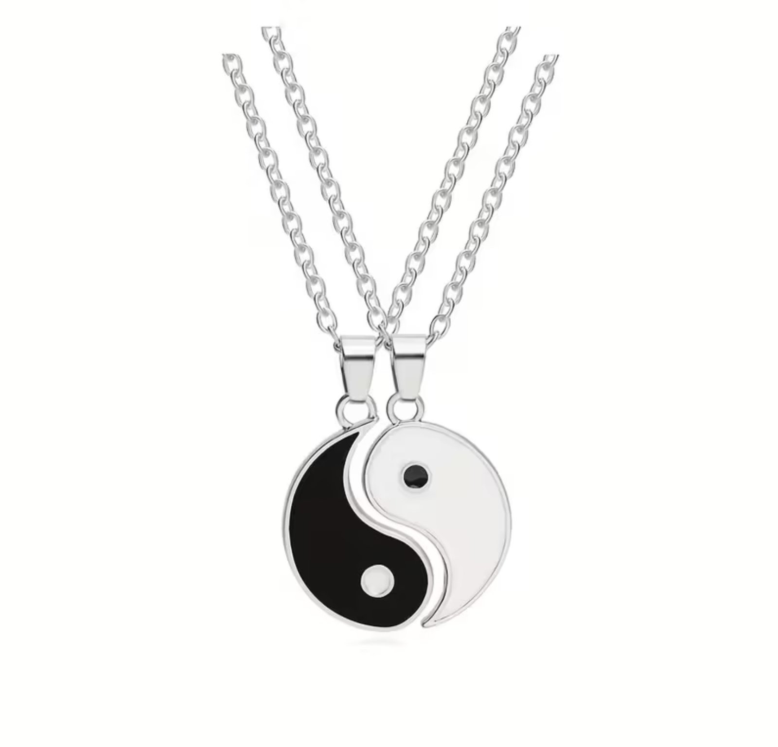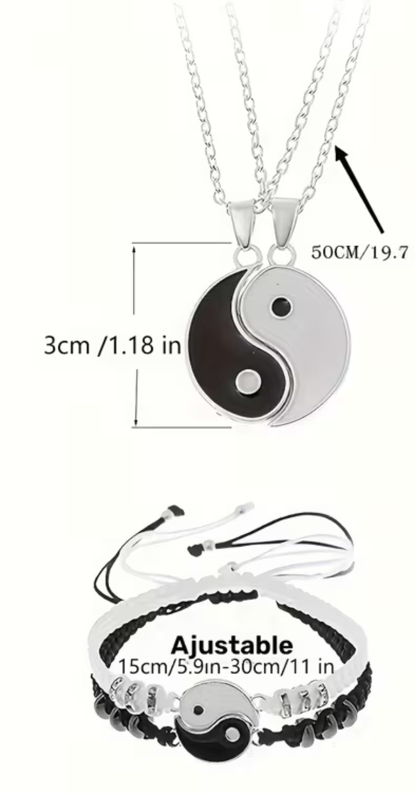 Set de pareja Yin Yang de 4 piezas elaborado en acero inoxidable, compuesto por dos collares y dos pulseras. Su diseño simbólico representa la armonía entre opuestos y la conexión en pareja, ideal para uso diario o para regalar como un detalle significativo y de estilo duradero.