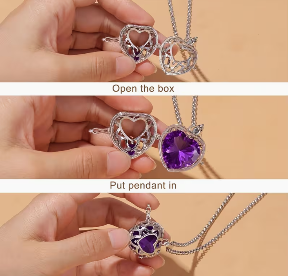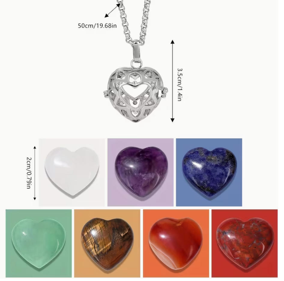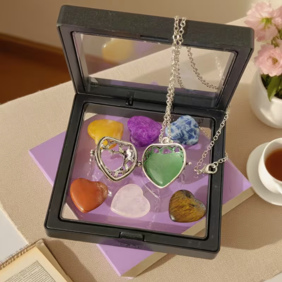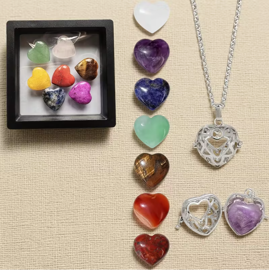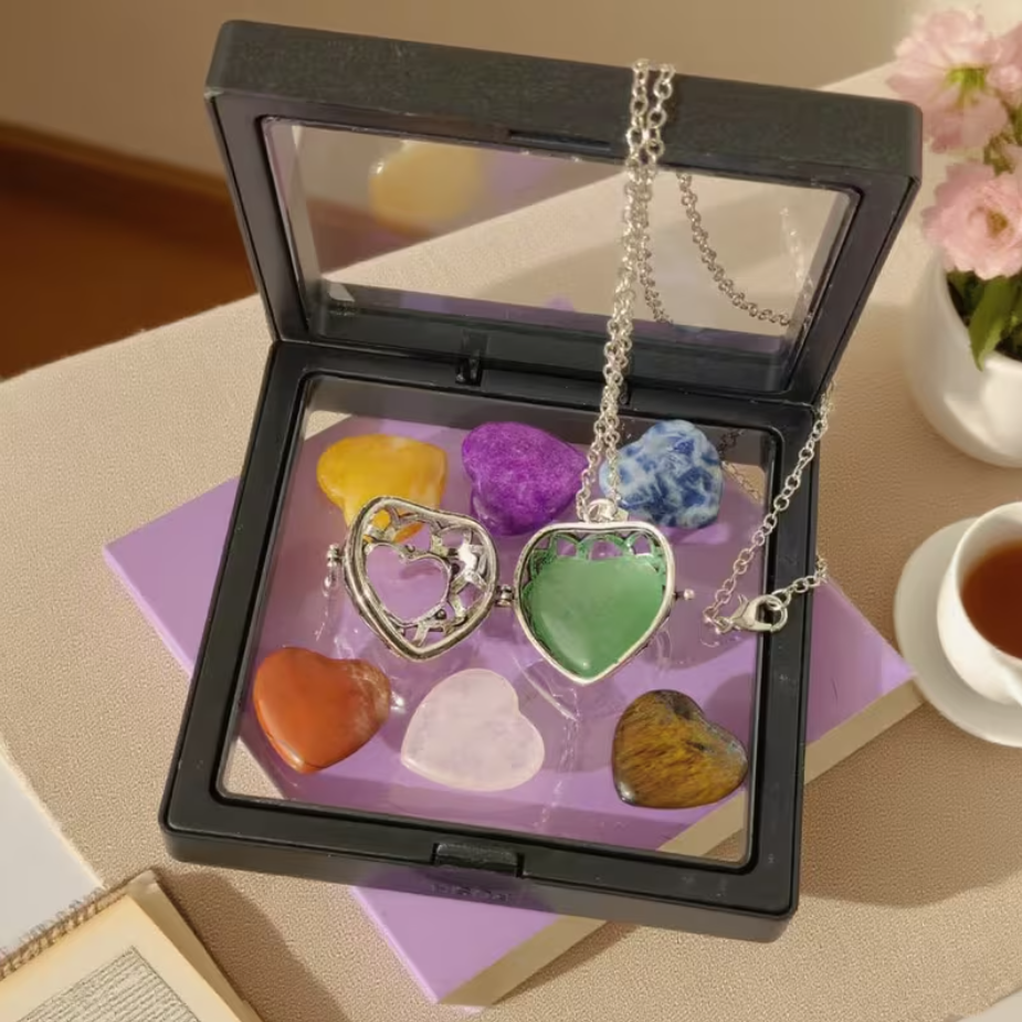 Set de relicario con 7 cuarzos naturales en forma de corazón intercambiables, cada uno con una intención energética distinta, ideal para acompañarte según tu estado emocional o intención del día.